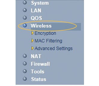 Select Wireless from the menu at the side of the page.