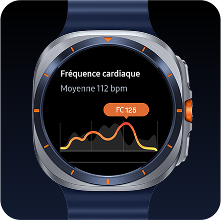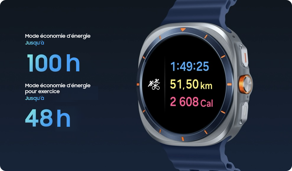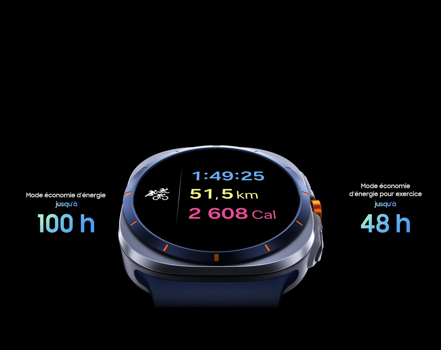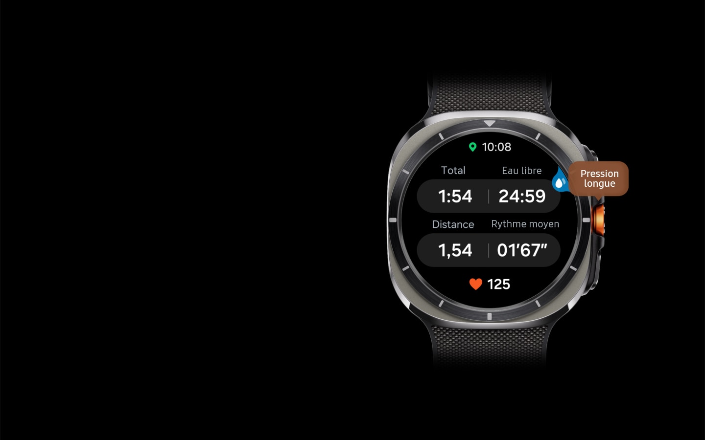 5. La montre Galaxy Watch Ultra est résistante à l’eau jusqu’à 10 minutes submergée à une profondeur de 100 mètres conformément à la norme ISO 22810. Le test a été effectué dans de l’eau salée à 5 % et de l’eau chlorée à 4 ppm. La Galaxy Watch Ultra a une cote de résistance à l’eau IPx8 selon des conditions en laboratoire du test d’immersion allant jusqu’à 1,5 mètre d’eau douce pendant près de 30 minutes. Elle ne convient pas pour les activités à haute pression d’eau et à la plongée sous-marine. Elle peut être utilisée pour des activités en eau peu profonde comme la nage dans une piscine ou l’océan. La résistance à l’eau n’est pas permanente et peut diminuer avec le temps. Voir le manuel de l’utilisateur pour en savoir plus, y compris les instructions d’entretien/d’utilisation.
