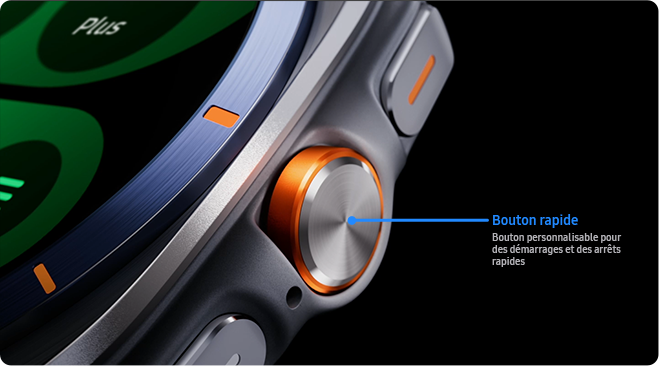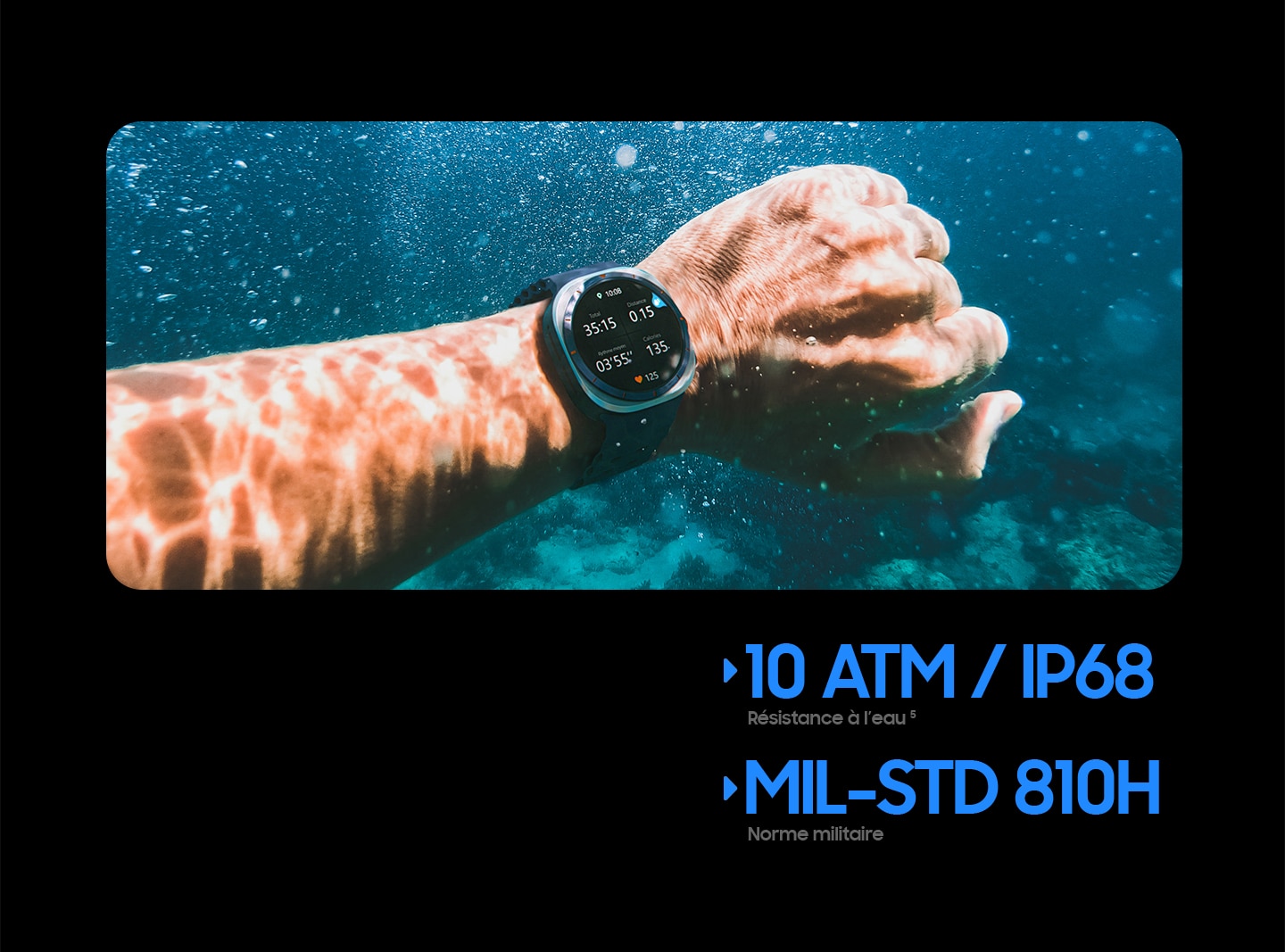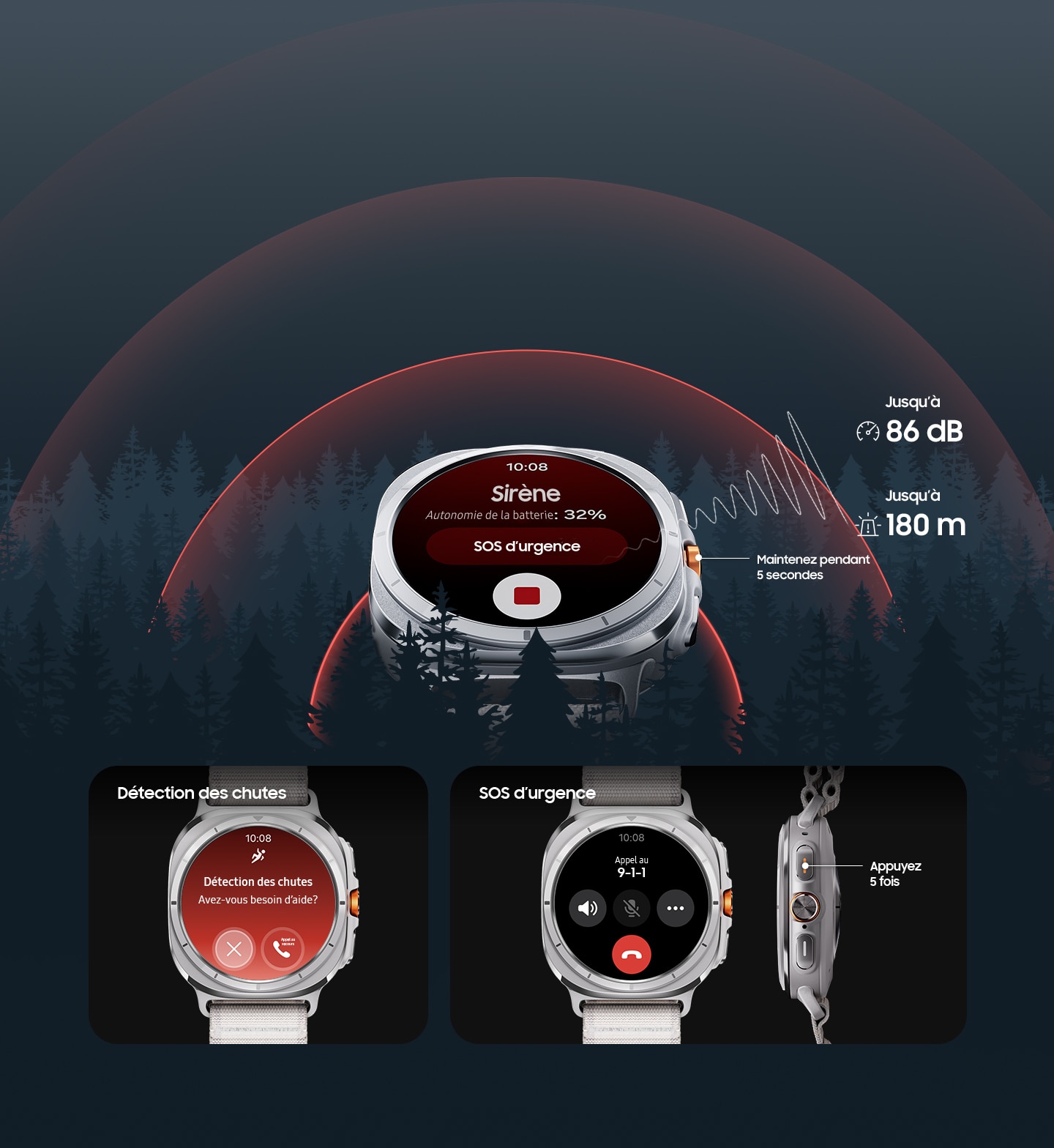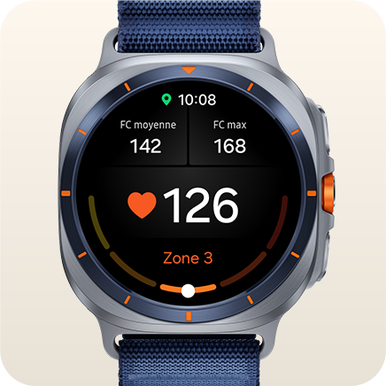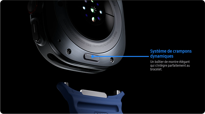 5. La montre Galaxy Watch Ultra est résistante à l’eau jusqu’à 10 minutes submergée à une profondeur de 100 mètres conformément à la norme ISO 22810. Le test a été effectué dans de l’eau salée à 5 % et de l’eau chlorée à 4 ppm. La Galaxy Watch Ultra a une cote de résistance à l’eau IPx8 selon des conditions en laboratoire du test d’immersion allant jusqu’à 1,5 mètre d’eau douce pendant près de 30 minutes. Elle ne convient pas pour les activités à haute pression d’eau et à la plongée sous-marine. Elle peut être utilisée pour des activités en eau peu profonde comme la nage dans une piscine ou l’océan. La résistance à l’eau n’est pas permanente et peut diminuer avec le temps. Voir le manuel de l’utilisateur pour en savoir plus, y compris les instructions d’entretien/d’utilisation.