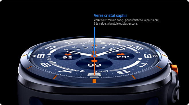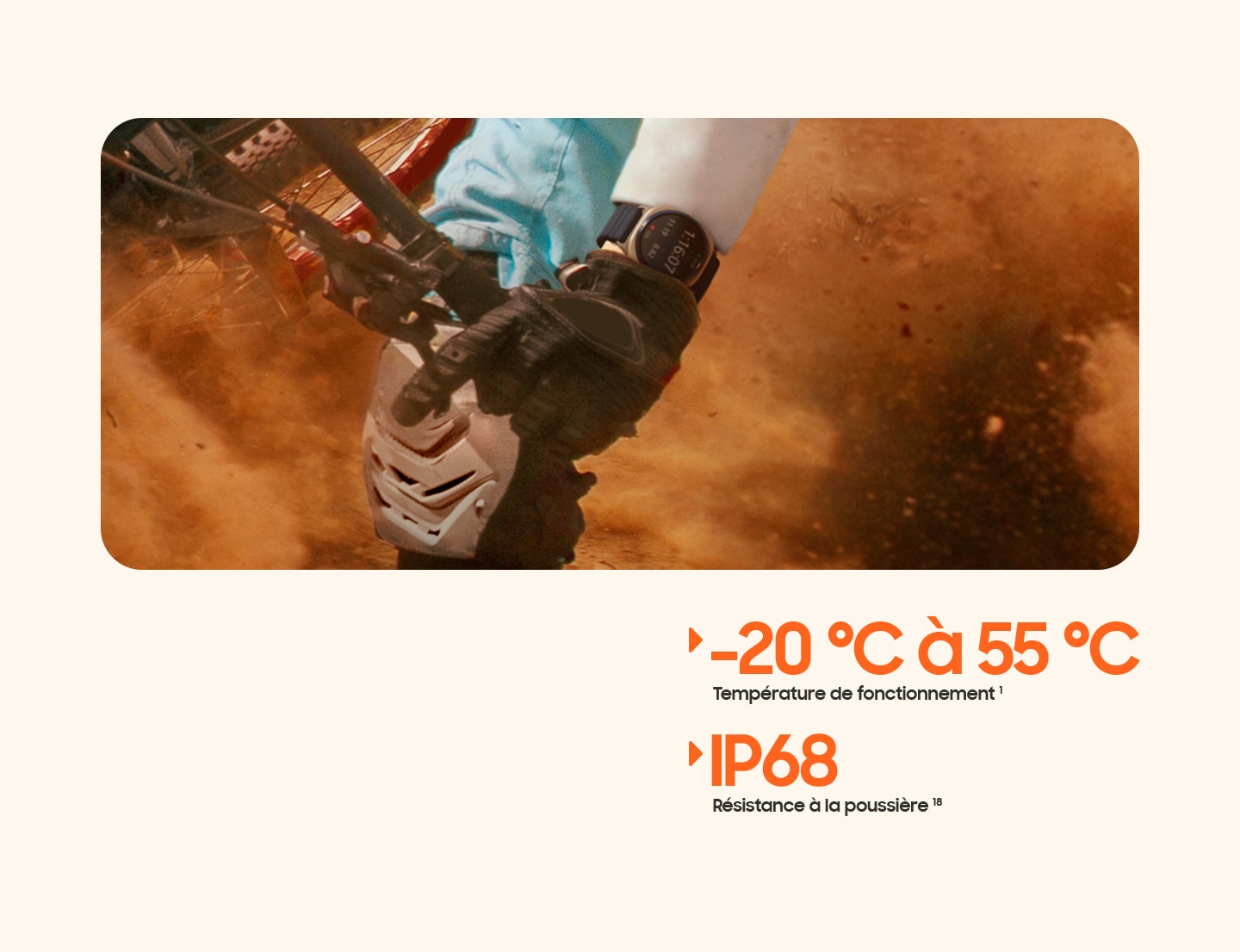 La montre Galaxy Watch Ultra prospère dans la chaleur, s’adapte aux environnements sombres et ensoleillés et vous aide à tracer votre chemin, vous permettant de naviguer facilement dans les sables et les dunes. Et même lorsque les conditions deviennent difficiles, elle continue de fonctionner. 6