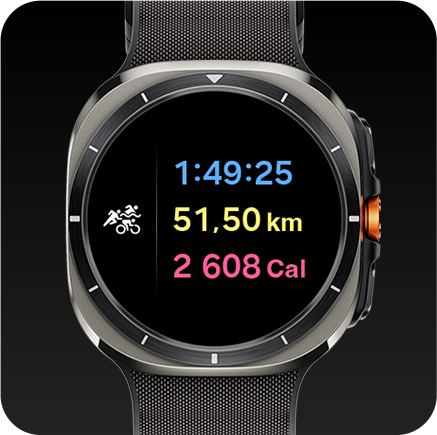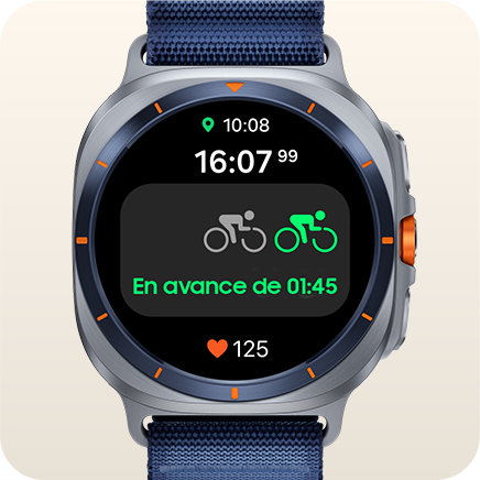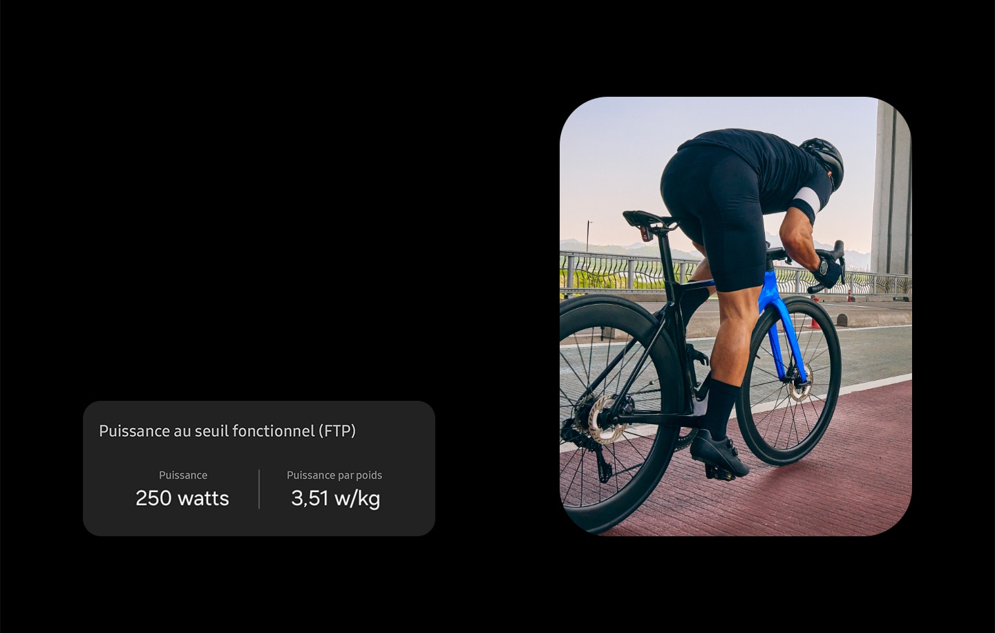 Maximisez votre puissance à vélo et faites un effort supplémentaire. Grâce à un compteur de puissance jumelé à votre téléphone intelligent Samsung Galaxy, Galaxy AI estime rapidement votre seuil fonctionnel de puissance (FTP) en fonction de votre fréquence cardiaque dans les 10 minutes d’un trajet. Réglez l’intensité de votre entraînement en fonction de votre FTP et atteignez votre performance maximale. 26, 44