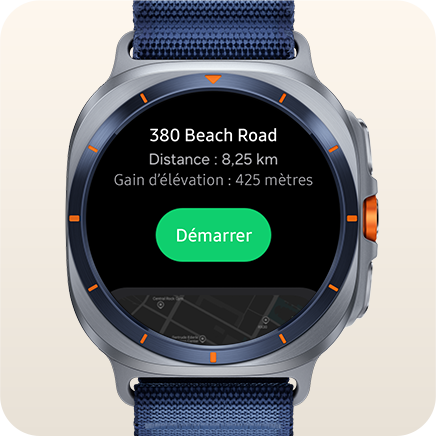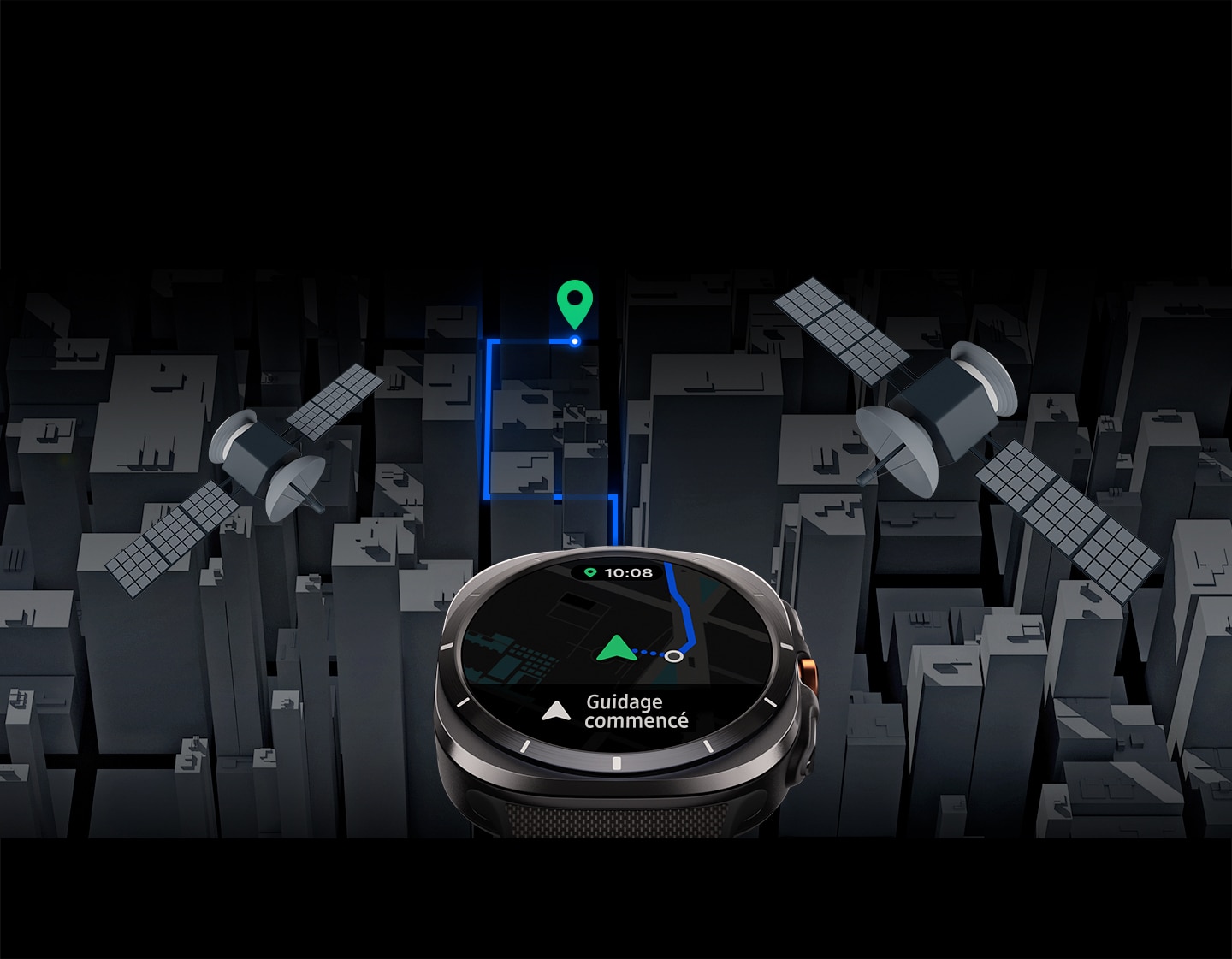 Notre GPS le plus précis à ce jour sur la montre Galaxy Watch vous permet de rester sur la bonne voie, même dans des zones urbaines denses. Intégrant des bracelets de fréquence L1 et L5, la montre Galaxy Watch Ultra vous suit avec une grande précision.8, 23, 24