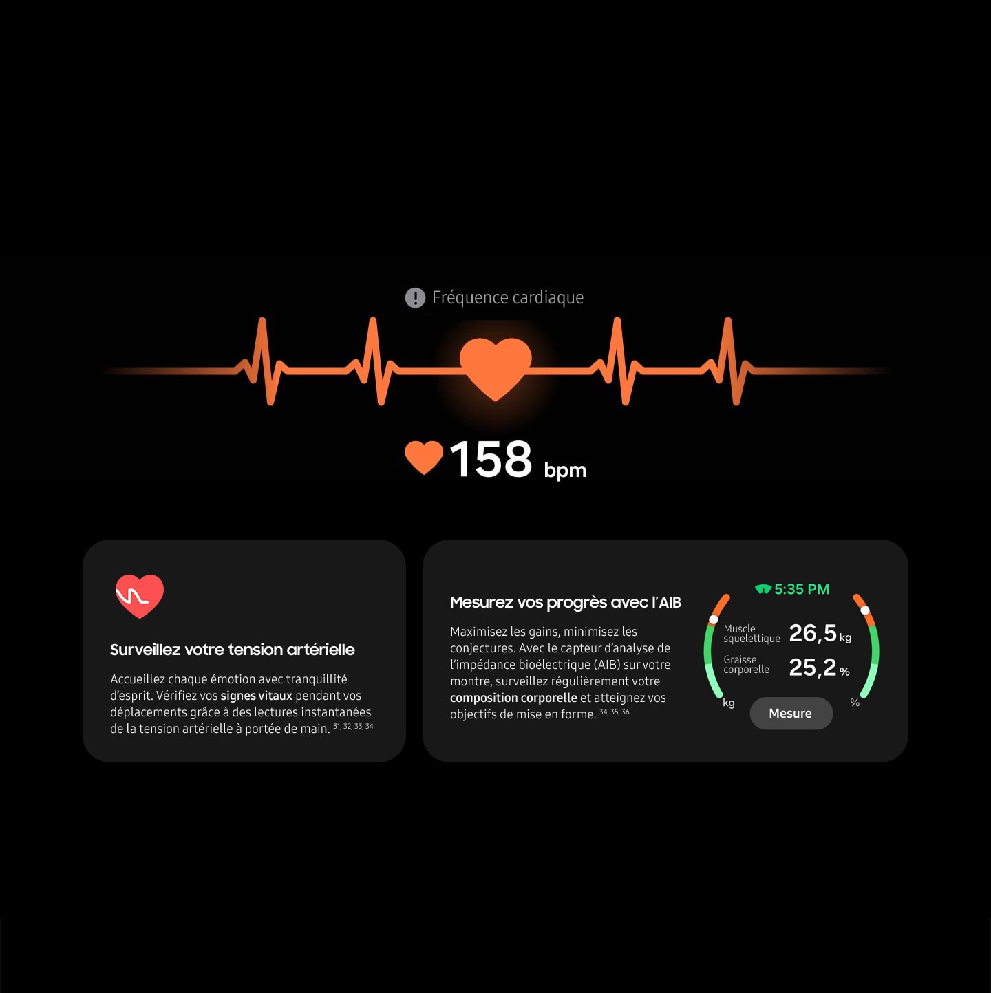 Maintenez un mode de vie sain en ajoutant un examen rapide à votre routine d’entraînement, de la tension artérielle à l’analyse de l’impédance bioélectrique. Lorsque la montre détecte un rythme cardiaque irrégulier, passez un ECG pour examiner votre rythme cardiaque plus en détail, directement sur votre poignet.