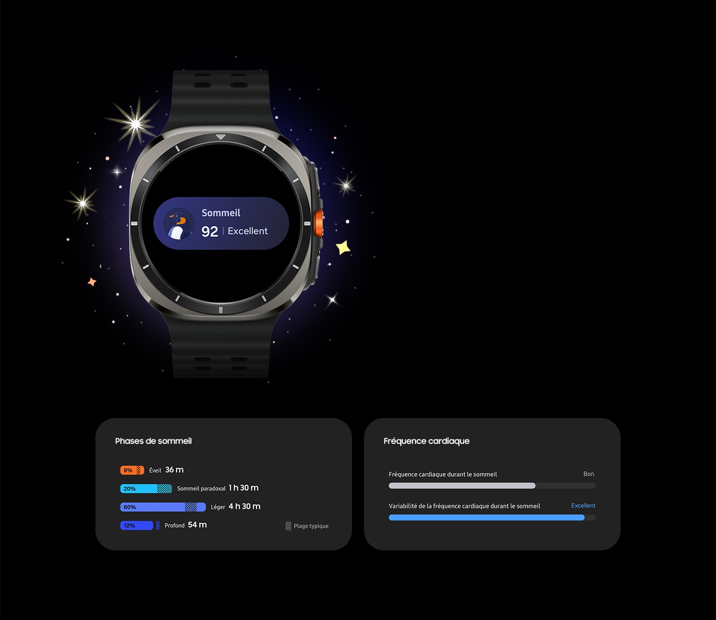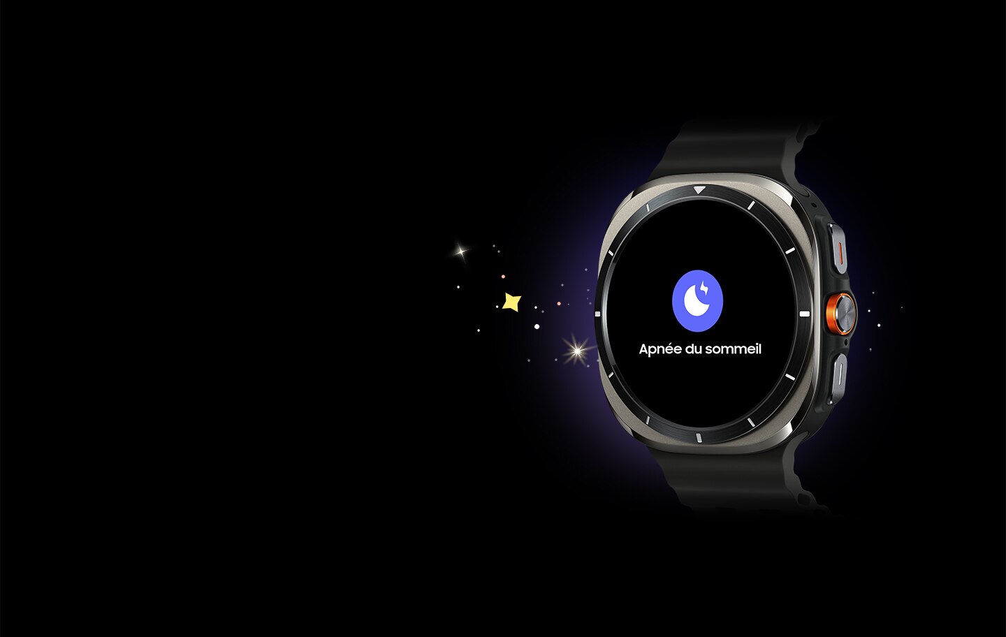 La montre Galaxy Watch Ultra surveille votre comportement de sommeil et aide à détecter les problèmes de sommeil potentiels. Pour la toute première fois sur la montre Galaxy Watch, elle offre la fonctionnalité d’apnée du sommeil.