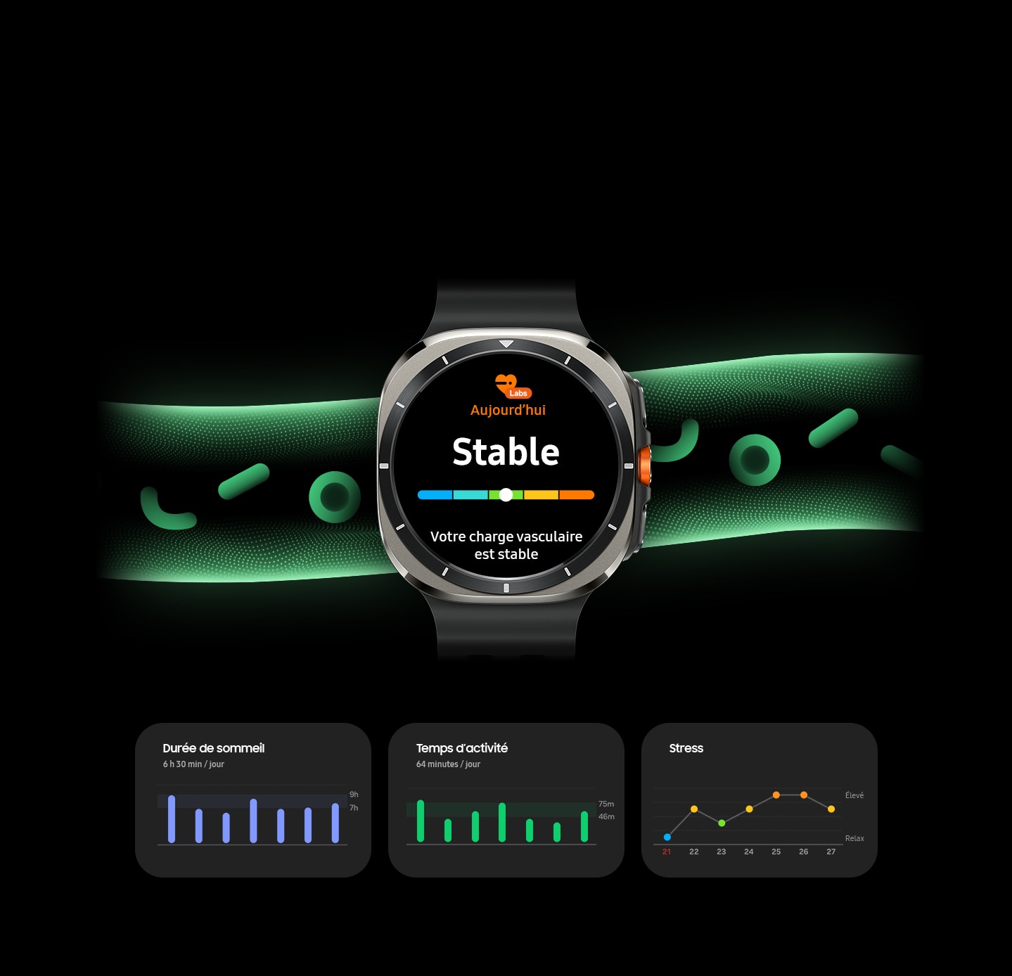 51. La résistance vasculaire, disponible sur les téléphones Android (Android 10 ou une version ultérieure), nécessite l’application Samsung Health (version 6.30 ou ultérieure). La connexion au compte Samsung est nécessaire. Pour mesurer la résistance vasculaire, il est nécessaire de porter la montre Galaxy Watch (Galaxy Watch Ultra, Watch8 et les versions ultérieures de la gamme Galaxy Watch) en dormant pendant au moins trois jours pour les 14 derniers jours.