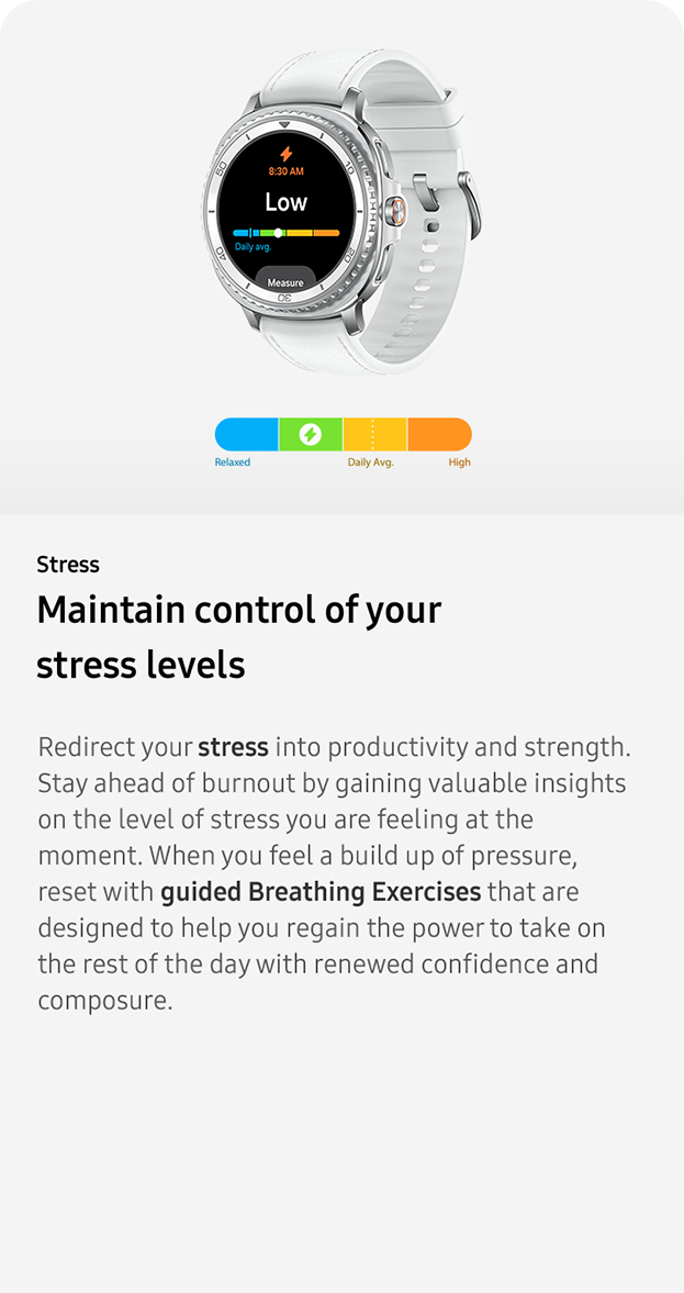 - Energy Score is available on Android phones (Android 10.0 or above) and requires Samsung Health app (v6.27 or above). Samsung account login is required. Service is only available when user registers their Galaxy Watch (Galaxy Watch4 or later released Galaxy Watch series) or Galaxy Ring through their Samsung account. Service availability may vary by country or region. Intended for general wellness and fitness purposes only. Not intended for use in detection, diagnosis, treatment of any medical condition or diseases. The measurements are for your personal reference only. Please consult a medical professional for advice. Accuracy of results is not guaranteed.