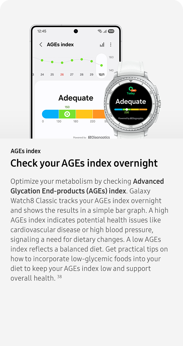 - Advanced Glycation End-products (AGEs) requires Samsung Account login, internet connection, and Samsung Health app v6.27 or later. Available on devices with Android OS 10 (Q OS) or later. AGEs is supported in Samsung Galaxy Watch7 and later released Samsung Galaxy Watch models only. Not intended for use in detection, diagnosis, treatment of any medical condition. AGEs index is for your personal reference only. Please consult a medical professional for advice.