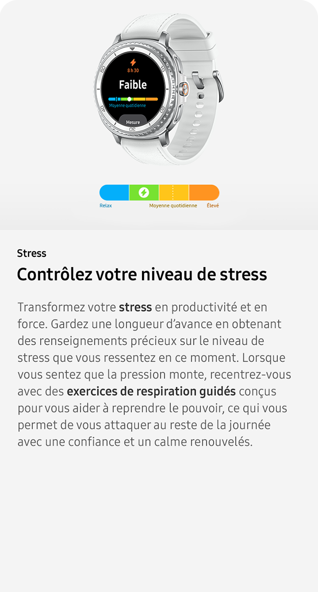 8. E notation de l’énergie est disponible sur les téléphones Android (Android 10.0 ou une version ultérieure) et nécessite l’application Samsung Health (version 6.27 ou supérieure). La connexion au compte Samsung est nécessaire. Le service est seulement disponible lorsque l’utilisateur inscrit sa montre Galaxy Watch (Galaxy Watch4 ou les gammes de montres Galaxy Watch ultérieures) ou la Galaxy Ring au moyen de son compte Samsung. La disponibilité du service peut varier selon le pays ou la région. Destinée uniquement à suivre votre état général de bien-être et votre condition physique. N’est pas destinée à détecter, diagnostiquer ou traiter des problèmes médicaux ou des maladies. Les mesures ne sont données qu’à titre indicatif. Veuillez consulter un professionnel de la santé pour obtenir des conseils. L’exactitude des résultats n’est pas garantie.