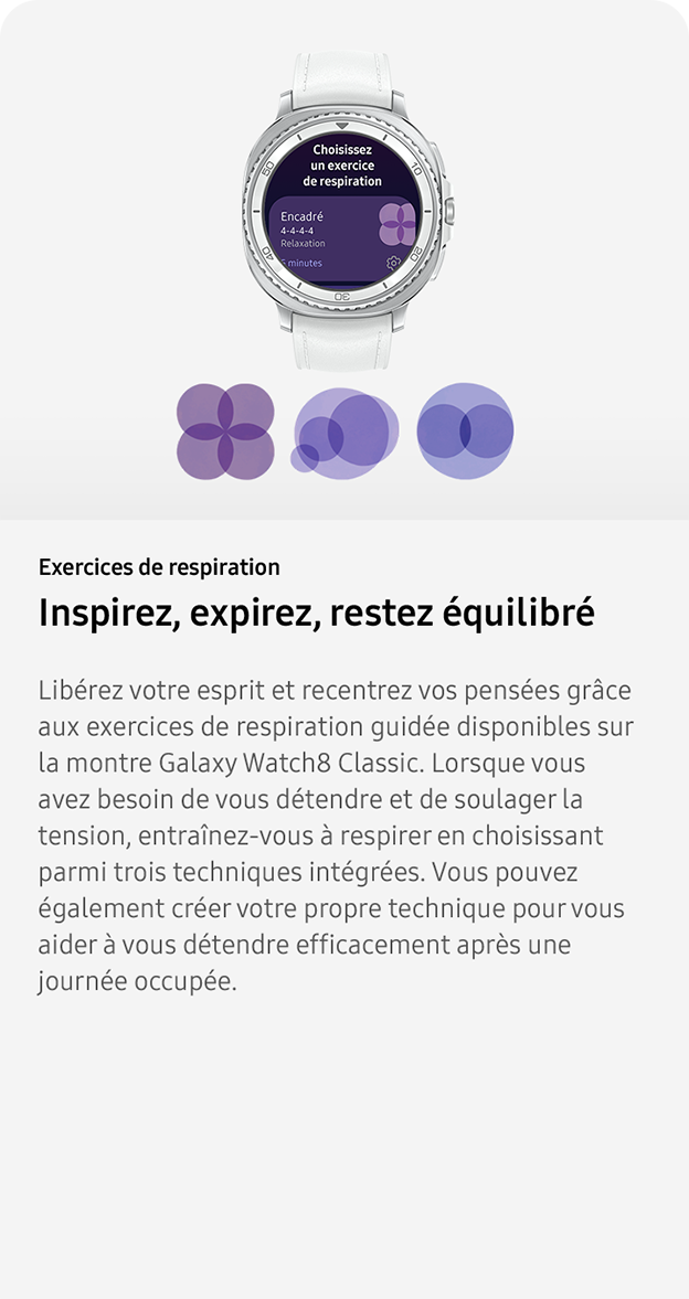 du sommeil. Vérifiez les signes d’apnée du sommeil avec la Galaxy Watch8 Classic. Tout au long de la nuit, la montre Galaxy Watch8 Classic suit les niveaux de saturation en oxygène et les baisses de saturation pour détecter les symptômes possibles, en utilisant la détection du risque d’apnée du sommeil. Le matin, passez en revue les détails de votre sommeil sur l’application Samsung Health Monitor pour voir si vous avez eu des difficultés à respirer pendant votre sommeil. Sensibilisez-vous à la qualité de votre sommeil grâce à la montre Galaxy Watch8 Classic14, 15, 16.