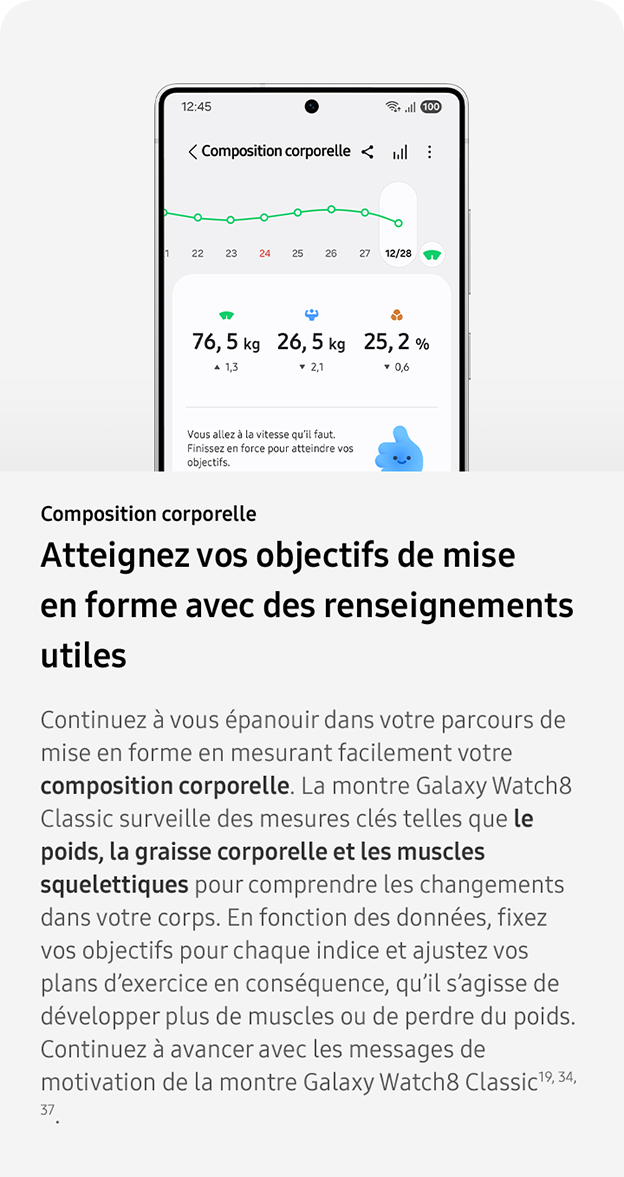 35. La composition corporelle n’est prise en charge que dans les modèles de la gamme Samsung Galaxy Watch4 et ultérieurs. La composition corporelle ne devrait pas être utilisée si vous avez un cardiostimulateur ou autre dispositif médical implanté ou si vous êtes enceinte. Toute information relative à la santé obtenue par l’appareil et l’application ne doit pas être considérée comme un avis médical. Les résultats des mesures peuvent ne pas être précis si vous avez moins de 20 ans. Les mesures ne sont données qu’à titre indicatif. Veuillez consulter un professionnel de la santé pour obtenir des conseils.