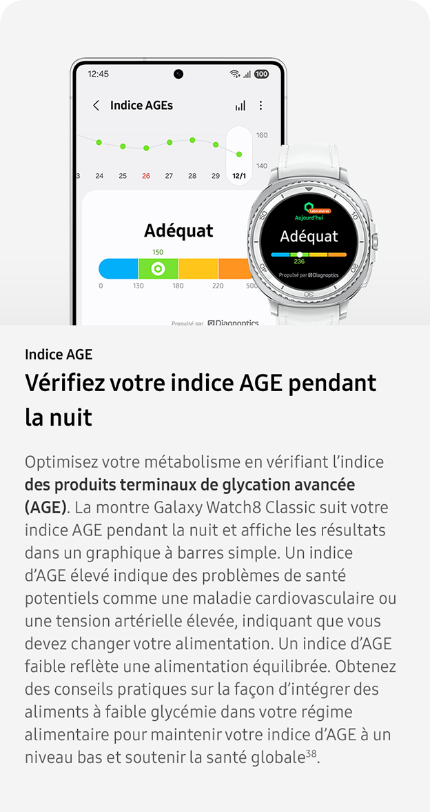 36. La mesure produits terminaux de glycation avancée (AGE) nécessite une connexion au compte Samsung et à l’application Samsung Health version 6.27 ou ultérieure. Disponible sur les appareils dotés du système d’exploitation Android OS 10 (Q OS) ou d’une version ultérieure. La mesure des produits terminaux de glycation avancée est prise en charge uniquement dans les modèles de la gamme Samsung Galaxy Watch7 et les modèles Samsung Galaxy Watch plus récents. N’est pas destiné à détecter, à diagnostiquer ou à traiter des problèmes médicaux. L’indice AGE est fourni à titre de référence personnelle seulement. Veuillez consulter un professionnel de la santé pour obtenir des conseils.